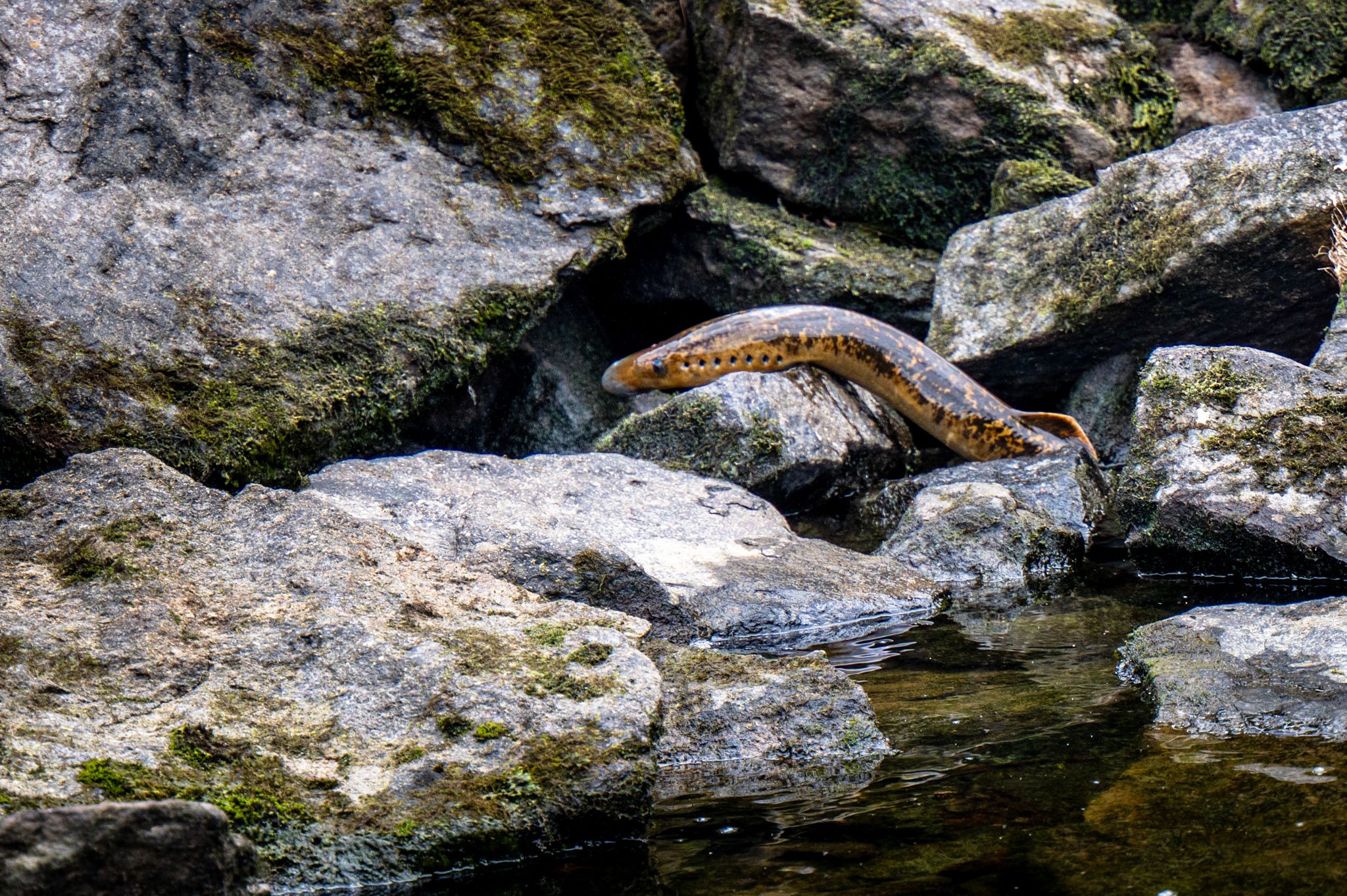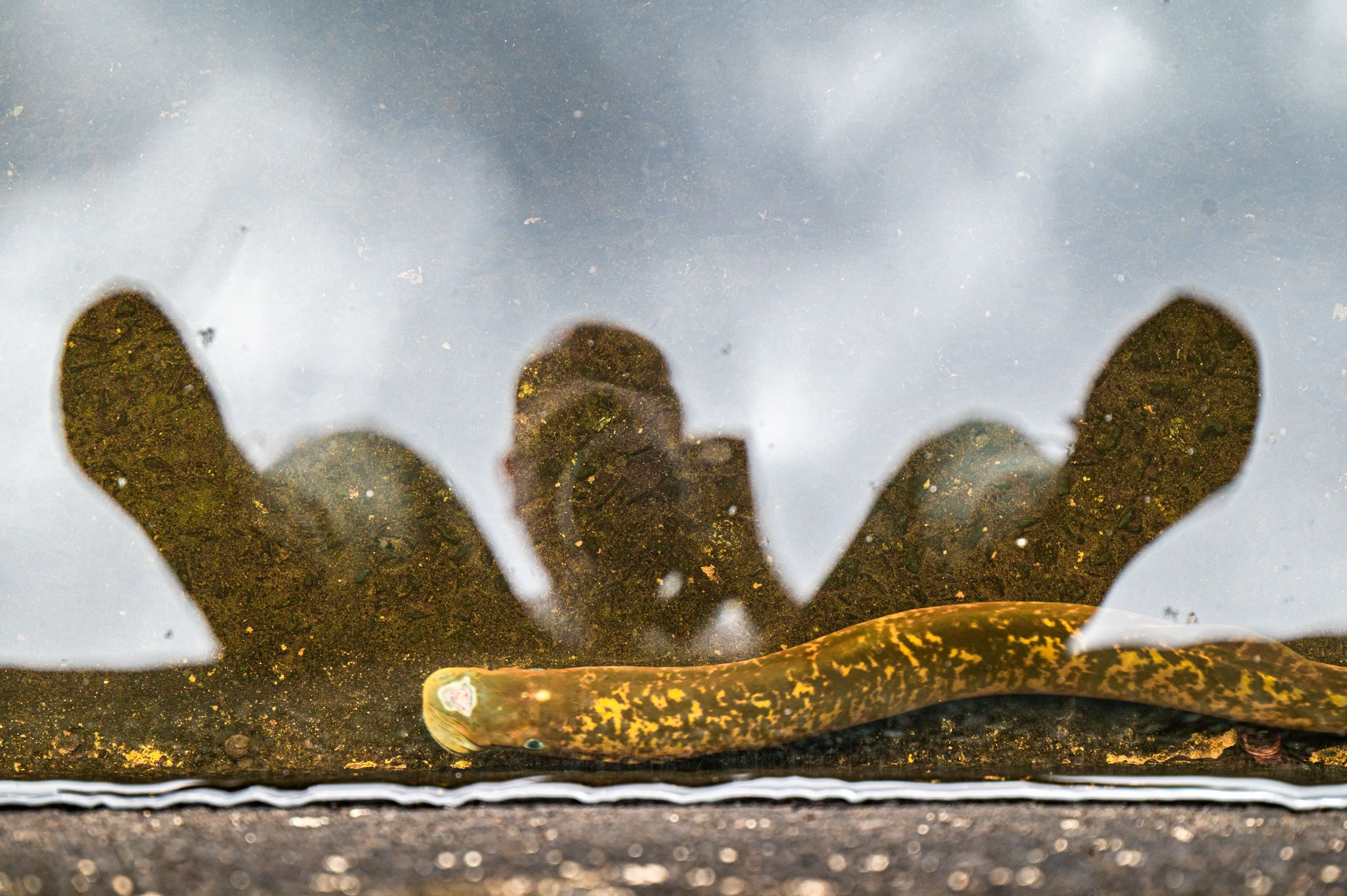 In Turners Falls, Massachusetts, I sat on a concrete wall above the spillway beside the town’s immense dam, watching several dozen sea lampreys swim in a clear pool. This was an animal I hadn’t even heard of until a week earlier. Splotched, multicolored, phallic, as long as a scarf or a donkey’s tail, they moved with supple undulations and then, for no reason I could discern, writhed their way out of the water onto bare rock, then back into the water again. They were old. Like, prehistoric old. Occasionally a grackle swooped down and nabbed a juvenile lamprey, the size of a big worm, and flew away with the lamprey writhing in its beak.